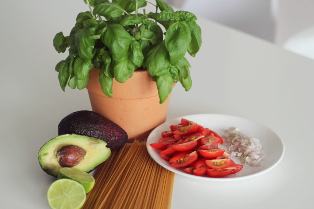 1. Stellt für die Nudeln zuallererst einen Topf mit Wasser auf den Herd und bringt das Wasser zum Kochen. Viertelt die Tomaten, schneidet die Schalotte in kleine Würfel und stellt das Gemüse zur Seite.