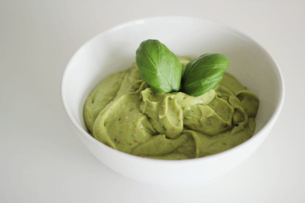 2. Halbiert und entkernt die Avocados. Das Fruchtfleisch könnt Ihr mit einem großen Löffel aus der Schale heben. Gebt es in einen Rührbecher. Fügt 2 EL Olivenöl, Saft und Abrieb der Limette und die Sahne hinzu. Püriert alles fein bis das Ganze eine cremige Konsistenz annimmt. Schmeckt die Avocado-Creme mit Salz, Pfeffer und Chiliflocken ab.
