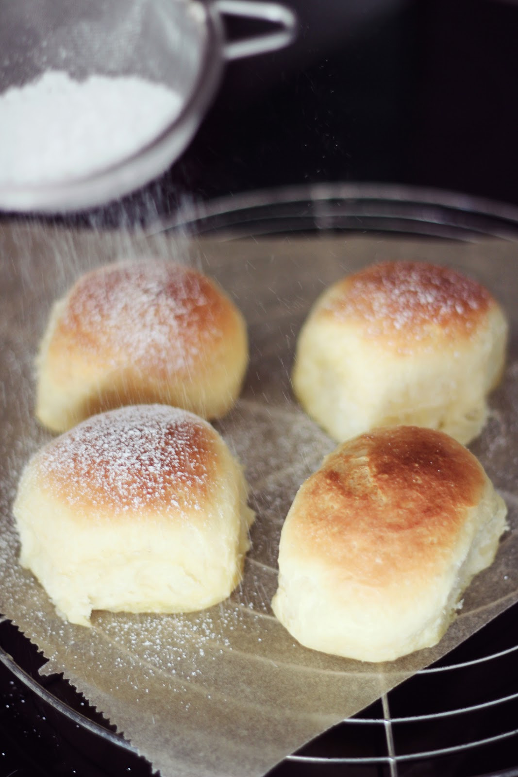 Man kann die Hefeteigkugeln natürlich auch mit Pflaumenmus oder anderen fruchtigen Aufstrichen füllen. Aber ich persönlich mag sie am liebsten ohne Füllung. Wer sie zum ersten Mal backen möchte, sollte auch am besten zunächst meine einfachere Variante probieren. Ihr solltet vor allem Ausdauer und starke Arme oder eine Küchenmaschine haben. Denn die guten Stücke brauchen viel Zeit zum Gehen und müssen ordentlich durchgeknetet werden.