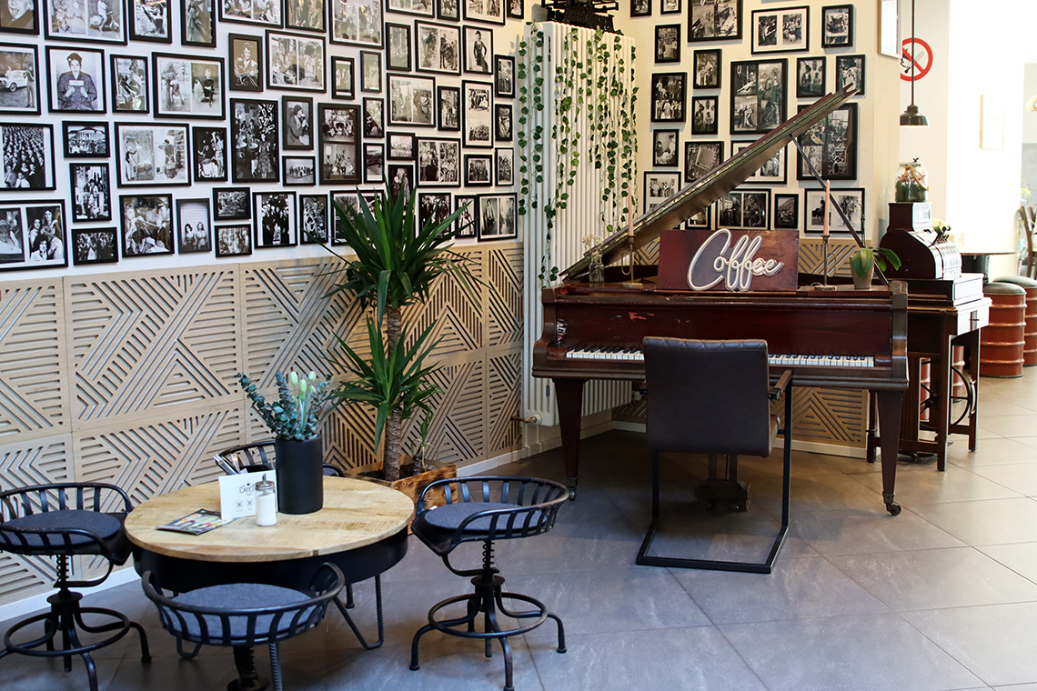 Vom Chesterfield-Sofa aus hat man einen wunderbaren Blick auf das ganze Café – den Eingangsbereich, die Theke und besonders eine eindrucksvolle Fotowand. Dicht an dicht hängen dort Schwarz-Weiß-Fotos in schwarzen Rahmen. „Zwei Wochen haben wir daran gearbeitet“, erzählt Hacer Tekin stolz. Viele Rahmen wurden extra schwarz lackiert. Die Wand zeigt viele Persönlichkeiten früherer Jahrzehnte, beispielsweise Elvis Presley oder Marilyn Monroe, aber auch Fotos aus Tekins Kindheit. Einige davon wurden mit der Polaroidkamera ihrer Eltern aufgenommen, die ebenfalls ausgestellt ist. Tekins Sohn hat sich ebenfalls eingebracht und mit Freunden Fotos im Stil der 70er-Jahre nachgestellt. Wie viele es insgesamt sind, weiß die Inhaberin selbst nicht, doch die Fotowand ist ein echter Hingucker. Davor steht ein alter Flügel. Ob er noch spielbar ist, sei dahingestellt, aber optisch ist er ein echter Hingucker. Zehn Personen haben ihn in fünf Einzelteilen ins Café getragen.