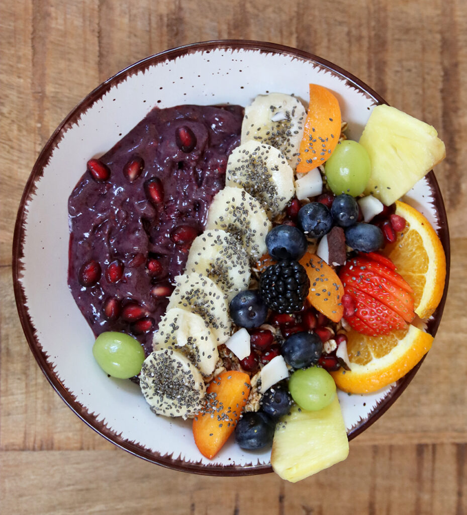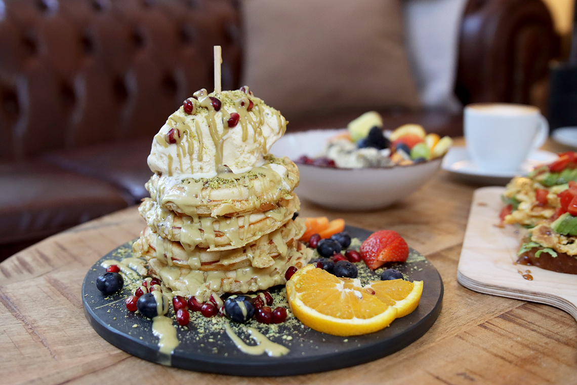 Nach dem Interview sind wir hungrig: Meine Begleitung probiert „Purple Paradise“ – eine erfrischende Frühstücks-Bowl mit pürierten, gefrorenen Früchten, Joghurt, Acai-Pulver und zahlreichen Toppings wie Obst, Nüssen und Granola. Ich entscheide mich für Pancakes. Eigentlich die klassische Version, doch Hacer Tekin empfiehlt mir eine Variante mit Pistaziencreme. Die vier gestapelten Pancakes werden von einer Kugel Vanilleeis gekrönt. Eis zum Frühstück? Warum nicht? Es passt wunderbar. Die Pancakes sind fluffig, mit viel frischem Obst und köstlicher Pistaziencreme – auch zwischen den einzelnen Lagen. Eine echte Empfehlung!
