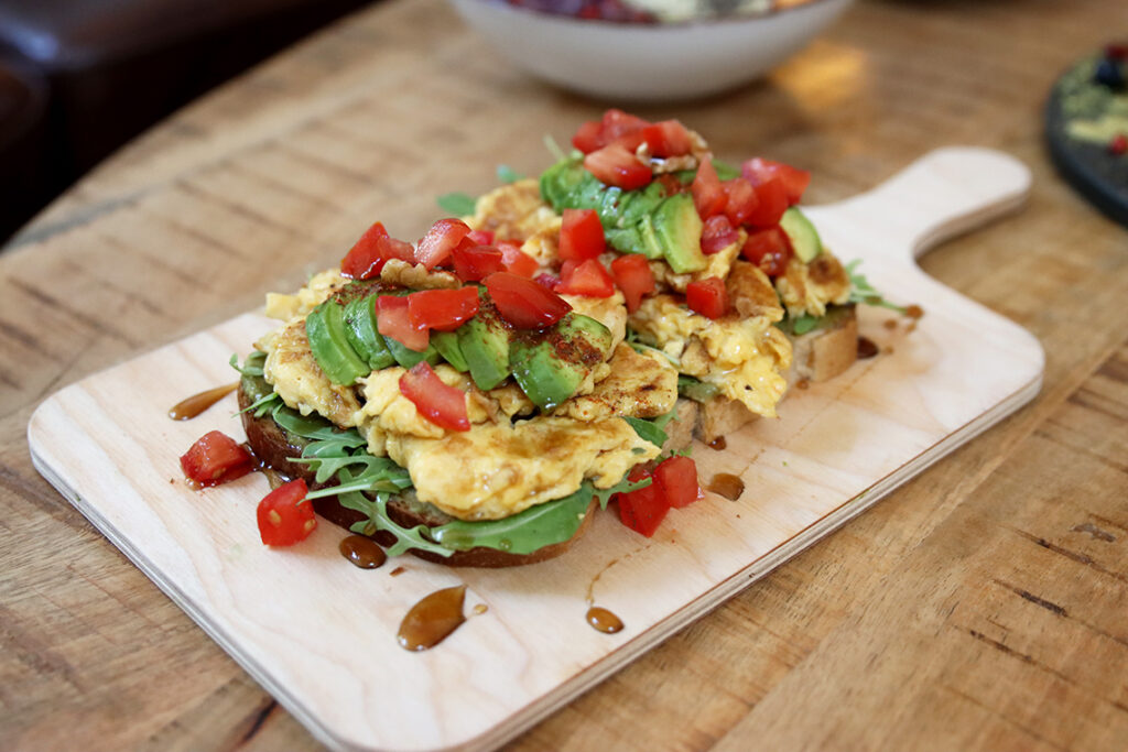 Obwohl wir satt sind, probieren wir auch den Favoriten der Gäste: „Avo-Love“. Eine reichlich belegte Stulle mit Avocadocreme, Rucola, Tomaten, Walnüssen, Granatapfelsirup und Rührei – für 9,90 Euro eine üppige Portion und auch als Mittagessen geeignet.