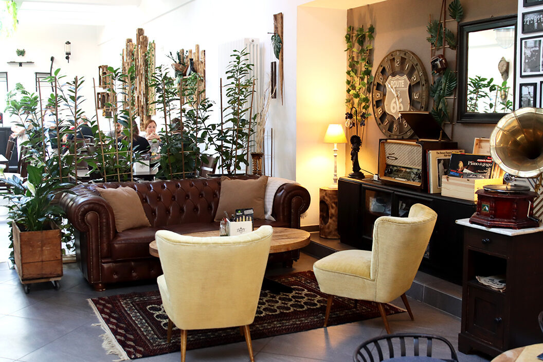 Betritt man das großräumige Lokal, begibt man sich sofort auf eine kleine Zeitreise. Mein Blick fällt als Erstes auf das einladende Chesterfield-Sofa in der Mitte des Cafés. Daneben steht ein altes Radio, aus dem leise Musik ertönt. Gleich daneben entdecke ich ein Grammophon – das erinnert mich sofort an meine Kindheit, denn auch bei Freunden meiner Eltern stand eines im Wohnzimmer. An den leicht knisternden Sound erinnere ich mich gerne zurück.
