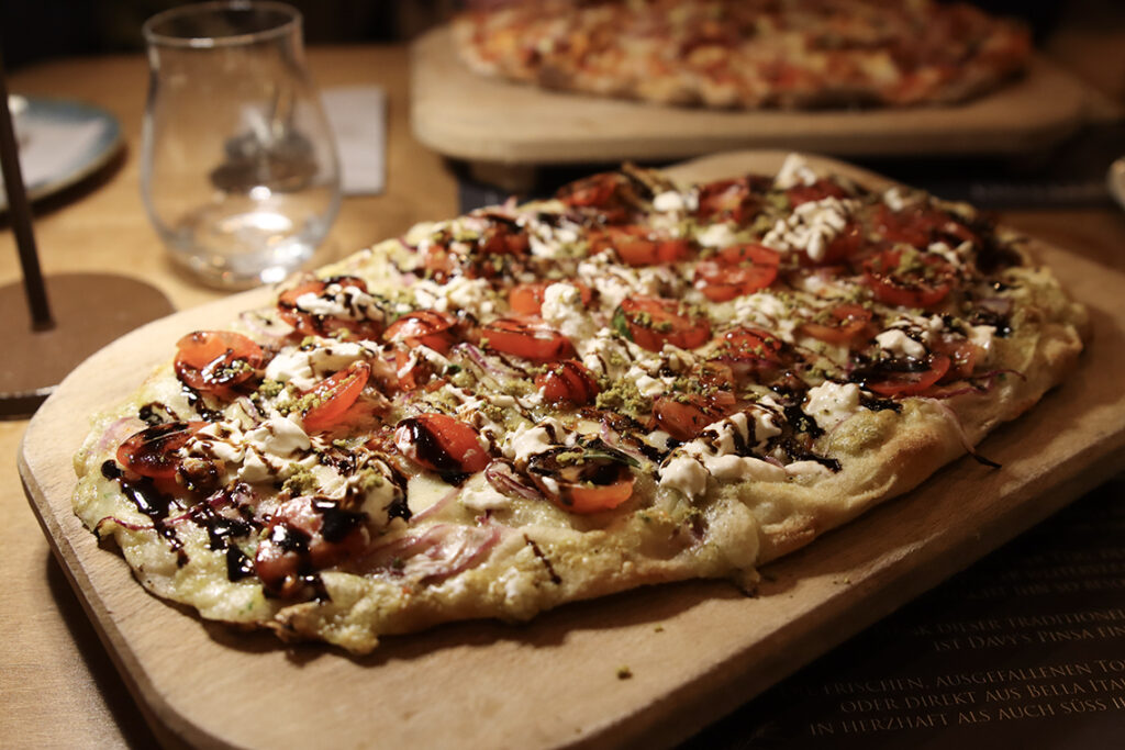 Ich wähle die vegetarische „Aphrodite“ mit Pistazienpesto, Mozzarella, getrockneten Tomaten, angemachten Zwiebeln, Cherrytomaten, Burrata und Balsamico. Zum Glück habe ich die Zwiebeln nicht abbestellt – sie runden das Ganze perfekt ab. Eine Pinsa, die ich problemlos jede Woche essen könnte. Auch bei vielen Stammgästen der Pinseria ist diese vegetarische Option total beliebt, die natürlich auch als vegane Version serviert wird.