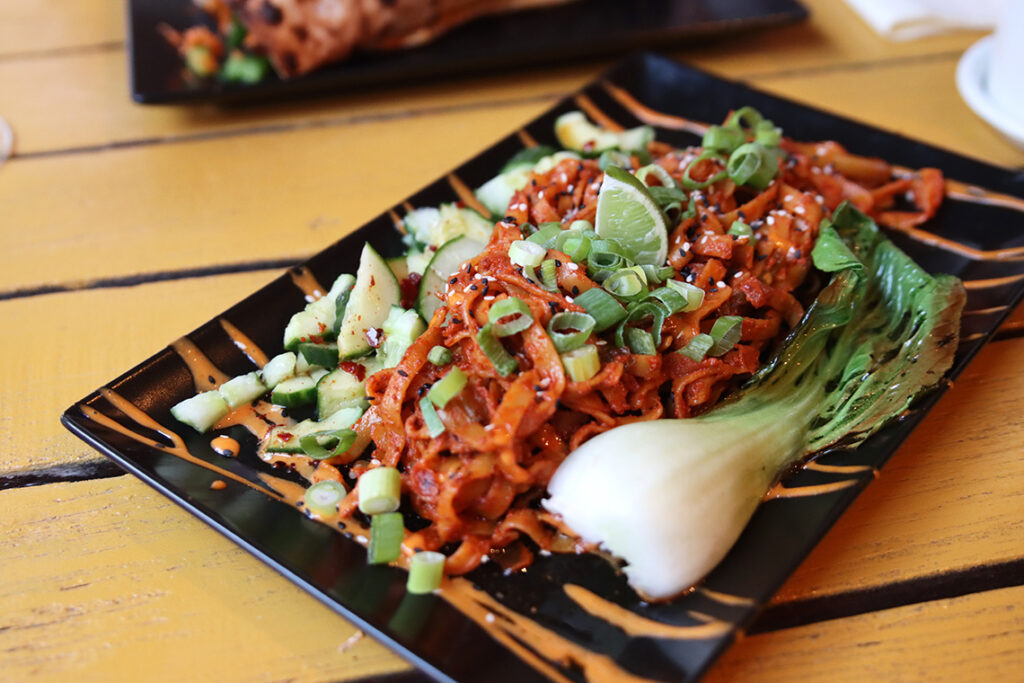 Spicy Gochujang Pasta: Tagliatelle in Spicy Gochujang-Soße mit Ingwer, Zwiebeln, Knoblauch, Frühlingszwiebeln, Sojasahne, Honig, Tahin, gerösteter Sesam. Dazu Pak Choi, Sriracha Coconut Soße, und Smash-Gurken, mit Soja Soßen Dressing