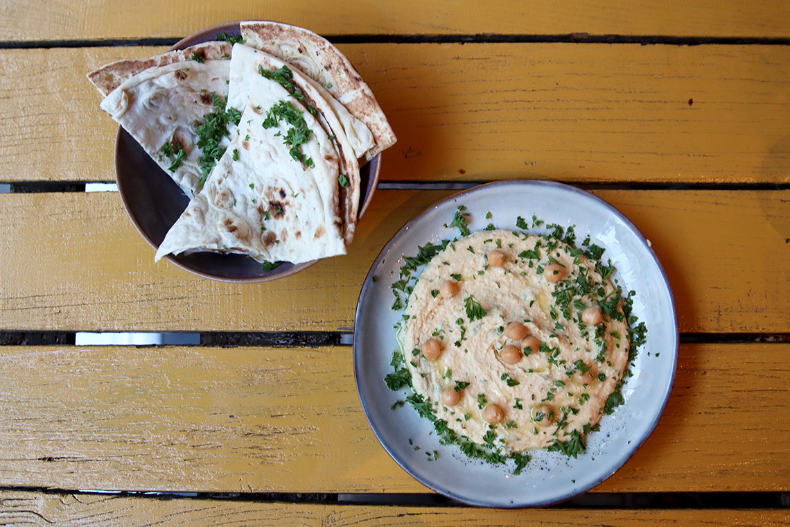 Als Vorspeise wählen wir Hummus – klassisch mit Kichererbsen, Tahin, Zitronensaft und Knoblauch, garniert mit Petersilie und serviert mit Fladenbrot. Ideal zum Teilen und ein Gericht, das perfekt ins Konzept passt, denn Hummus ist üblicherweise vegan. Wer es spannender mag, bestellt den „Pink Hummus“ mit Roter Bete.