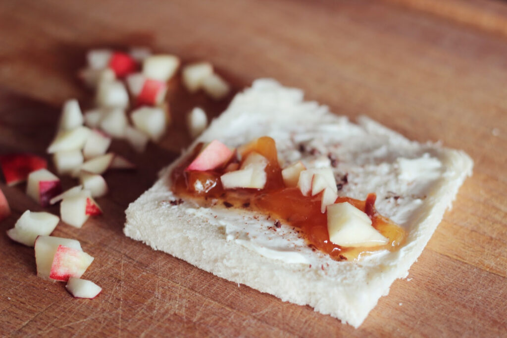• Nun könnt Ihr die Toastscheiben mit den Zutaten der jeweiligen Varianten belegen. Aber Vorsicht: Packt die Toastscheiben nicht zu voll, sie müssen ja noch zusammen gerollt werden.