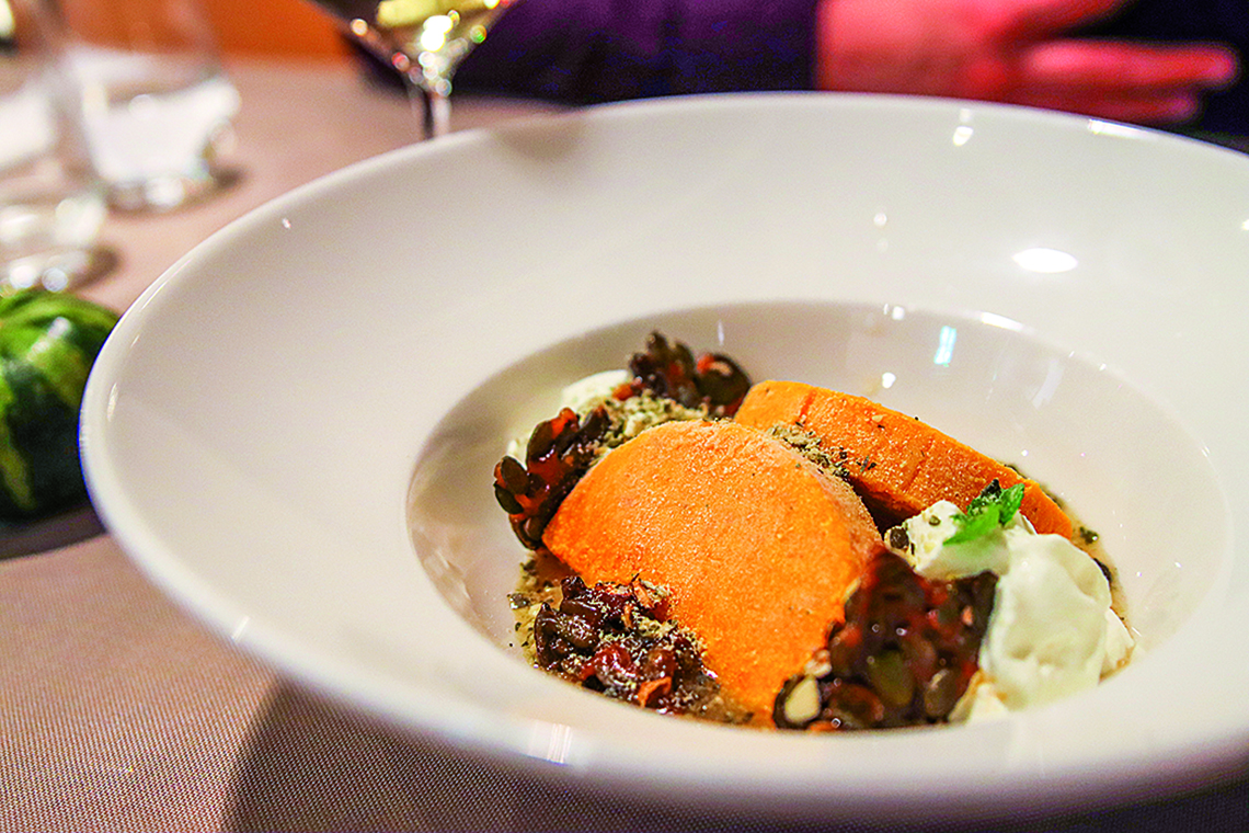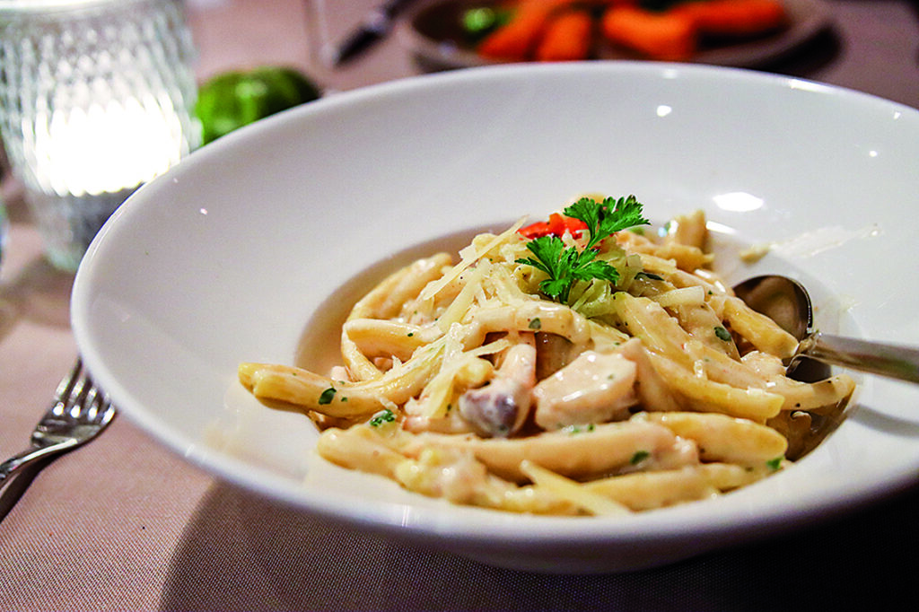 Kürbisparfait begeistert restlosAuch der Hauptgang lässt nicht lange auf sich warten. Ich wähle hausgemachte Pasta mit Kräuterseitlingen, die auch als vegane Variante erhältlich ist. Für meine Begleitung gibt es die gefüllte Maispoularde „Saartal meets Saltimbocca“ – gefüllt mit luftgetrocknetem Schinken aus Saarburg, Salbei aus dem hauseigenen Garten und Champignons. Dazu werden Jus, Bimi – auch Spargelbrokkoli genannt – und selbstverständlich hausgemachte Kroketten serviert. Passend dazu gönnen wir uns jeweils ein Glas Wein. Maria Mangrich berät uns persönlich. Der Küchenabschnittsgefährte entscheidet sich für einen Riesling Kabinett vom Ockfener Bockstein, mild in der Säure und hell im Glas. Ich wähle einen Auxerrois vom Weingut Carlsfelsen in Palzem, intensiv gelb und die perfekte Ergänzung zu meiner Pasta. Obwohl wir bereits gut gesättigt sind, verzichten wir nicht auf das Dessert. Besonders gespannt bin ich auf das Kürbisparfait, das ich bereits bei der Recherche entdeckt habe. Und es überzeugt auf ganzer Linie: Die Kombination aus Kürbis, Apfelkompott und einem Hauch Zimt ist großartig, das Nusskrokant setzt dem Ganzen die Krone auf. Ein Traum.