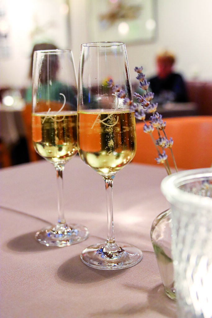 Zurück aus Saarburg werfen wir uns in Schale und machen uns auf den Weg ins hauseigene Restaurant. Wir starten – wie immer – mit einem Aperitif: Rieslingsekt vom Familienweingut Minn. Genau mein Geschmack, herrlich fruchtig. Fast zeitgleich wird der Gruß aus der Küche serviert: hausgebackenes Steinofenbrot mit Knoblauchdip. Zunächst bin ich skeptisch, doch hier stimmt die Balance – weder zu viel noch zu wenig Knoblauch. Bei den Vorspeisen bekommt der Küchenabschnittsgefährte eine Karotten-Ingwer-Suppe. Die leichte Schärfe des Ingwers harmoniert wunderbar mit der Süße der Karotten. Ich entscheide mich für „Großmutters Markklößchensuppe“ – perfekt für diesen verregneten Tag. Die würzige Brühe in Kombination mit dem Wurzelgemüse ist genau mein Ding, und zu Markklößchen sage ich ohnehin nie nein.
