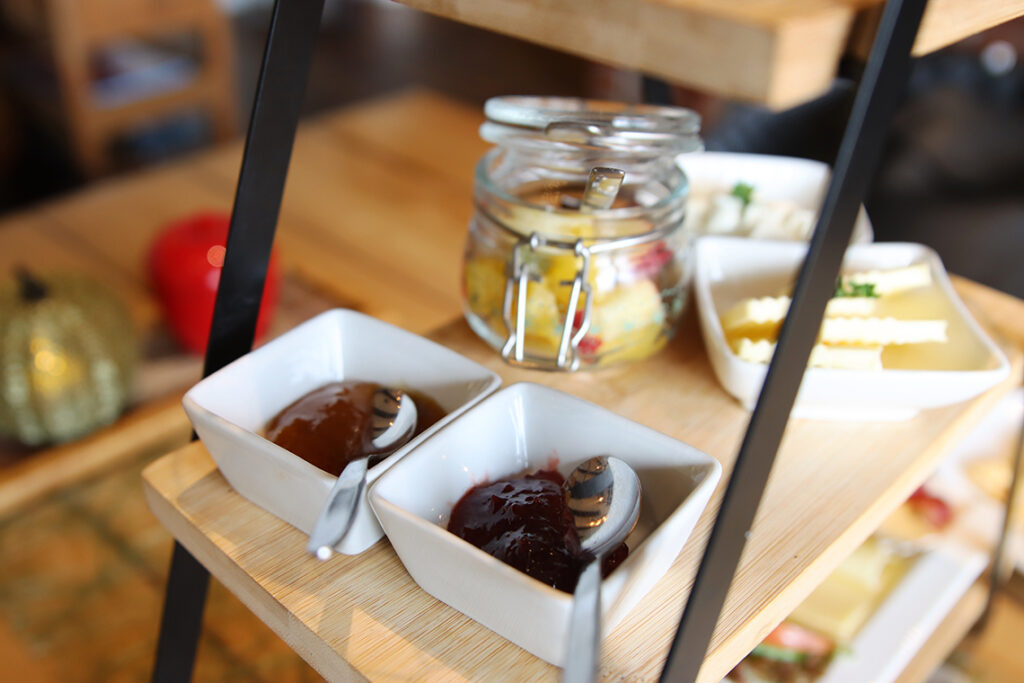 Das Frühstück – hier mit Pancakes und Marmelade – wird auf Etageren serviert. Dazu ein frischer O-Saft.