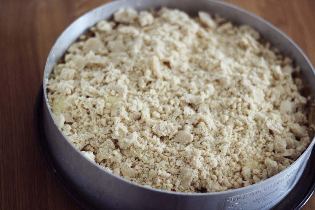 - Für die Streusel verknetet Ihr einfach alle Zutaten in einer Schüssel. Verteilt diese gleichmäßig, sodass kein Apfel mehr zu sehen ist.