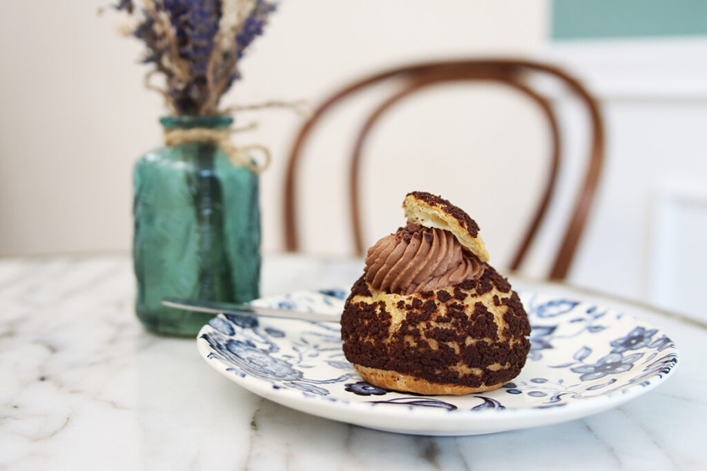 Wir entscheiden uns für einen Choux au Craquelin mit schokoladiger Füllung. Und allein der Anblick lässt uns fast dahinschmelzen. Meine Begleitung nimmt den ersten Bissen und ist begeistert vom Crunch in Kombination mit der Schokofüllung. Anschließend probiere ich ebenfalls und kann mich der Meinung der Freundin nur anschließen. Besonders der fein abgestimmte Süßegrad besticht im Geschmack. Hier rückt viel eher der Geschmack von feinster Schokolade in den Vordergrund, der nicht nur von der in der Füllung verarbeiteten Schokolade kommt, sondern auch von den kleinen Stückchen Valrhona-Schokolade, die dem Ganzen die Krone aufsetzen.