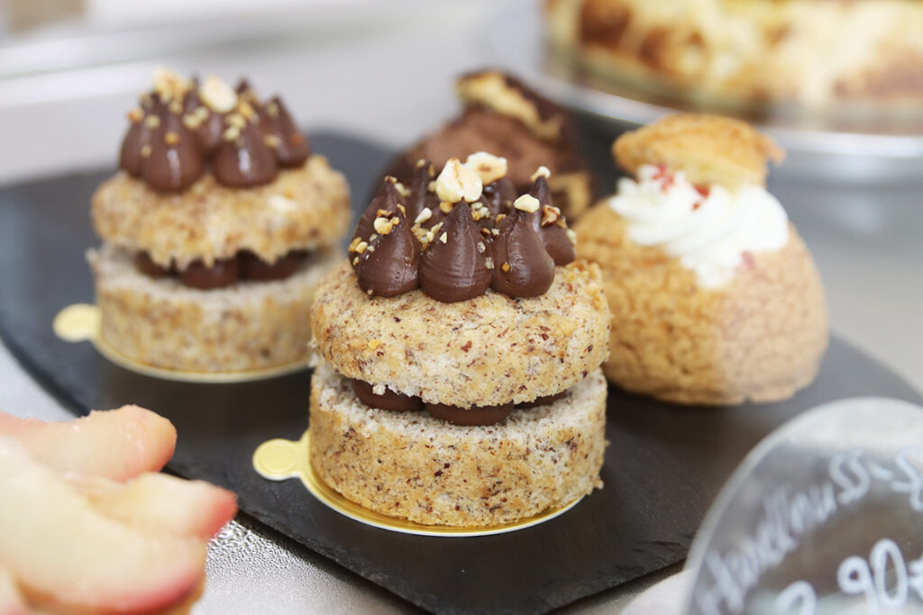 Ebenso möchte sie ihren Kunden vermitteln, dass es nicht immer einer überfüllten Auslage benötigt, um den Geschmack eines jeden zu treffen. Viel lieber hat sie weniger Produkte von hoher Qualität in ihrer Vitrine und somit am Abend auch weniger Überschuss, sprich Abfall. Diesen möchte sie ganz bewusst so gering wie möglich halten. Die Kalkulation hat sie mittlerweile dafür gut im Griff, sodass sie nur ganz selten Reste an Freunde und Familie verteilen kann. „Aber falls mal ein Choux au Craquelin überbleibt, esse ich den auch einfach selbst mal gern“, scherzt Ayten. Als Choux au Craquelin bezeichnet man einen französischen Windbeutel. Die gibt es bei „Renata Patisserie“ immer und zu jeder Jahreszeit. Sie werden mit unterschiedlichen Füllungen angeboten; mal mit hausgemachtem Vanillepudding oder auch mit Schoko- oder Kaffeesahne. Je nach Saison gibt es sie aber auch in ausgefalleneren Geschmacksrichtungen wie beispielsweise mit Matcha.