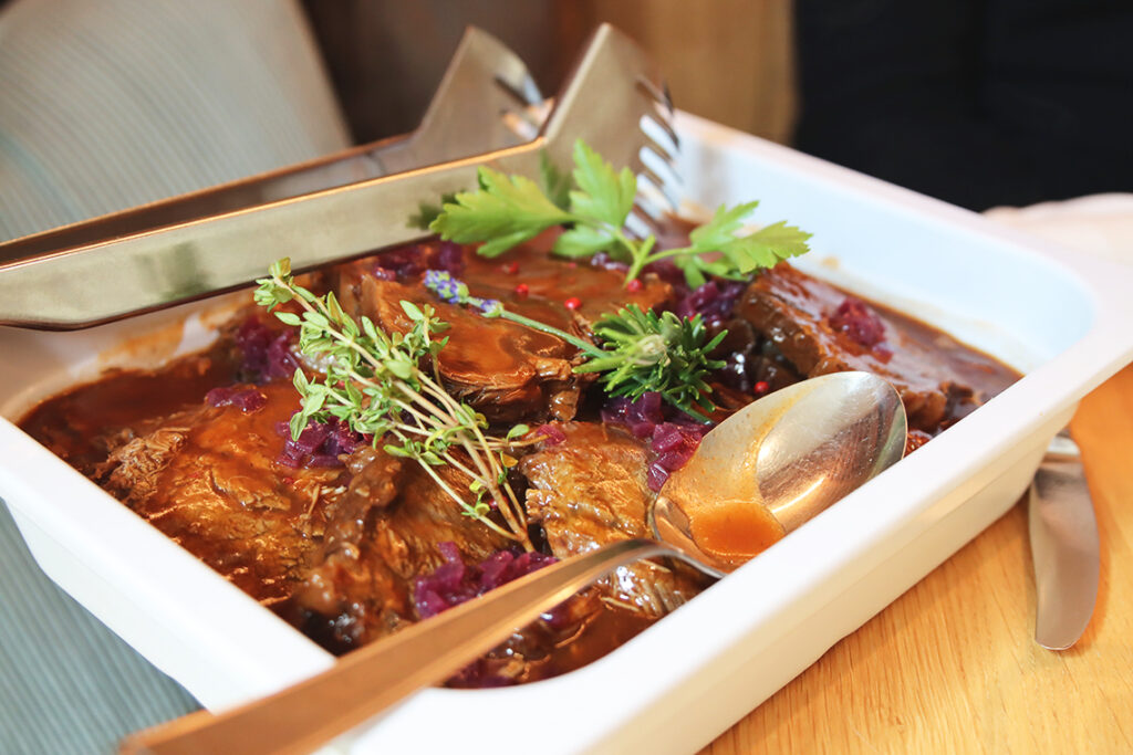 Nachdem wir mit einem Großteil der Familie Buchna zum wohl bekanntesten Aussichtspunkt des Saarlandes – der kleinen Cloef – spaziert sind, wartet schon das erste kulinarische Highlight auf uns. Zusammen mit den Buchna-Töchtern und deren Kindern dürfen wir im „Sägewerk“ zu Mittag essen. Küchenleiter Christian Münch-Buchna hat für uns so einiges gezaubert. „Das ist natürlich nur das kinderfreundliche Mittagessen“, fügt er hinzu, als er uns prall gefüllte Schalen mit allerhand Leckereien persönlich serviert. Lange habe ich Sonntagmittags nicht mehr so unfassbar gut gegessen. Kartoffelpüree, Rindfleisch mit der von mir heiß geliebten braunen Soße, dazu Salat und Gemüse. Mehr braucht es definitiv nicht, um mich glücklich zu machen.