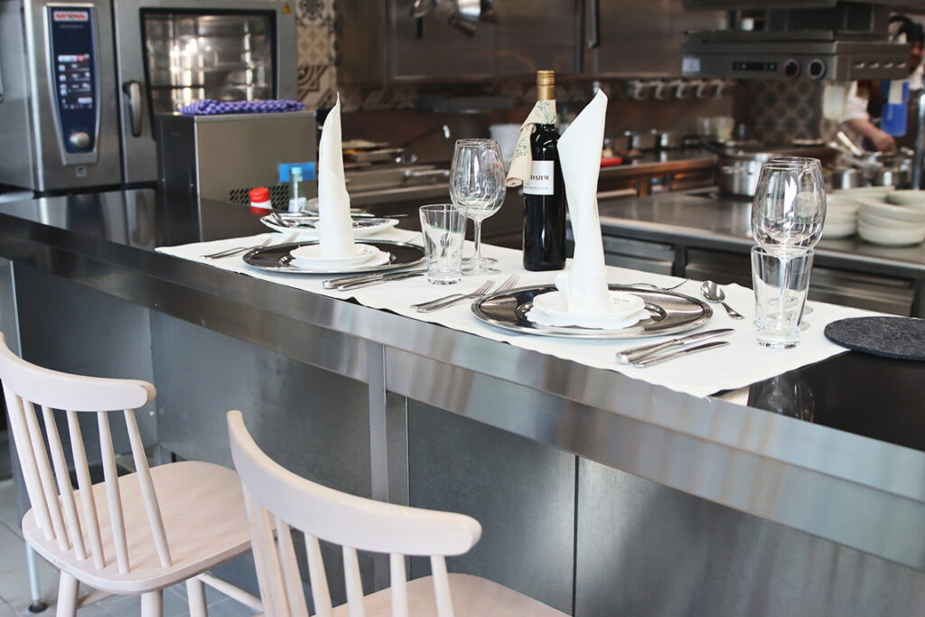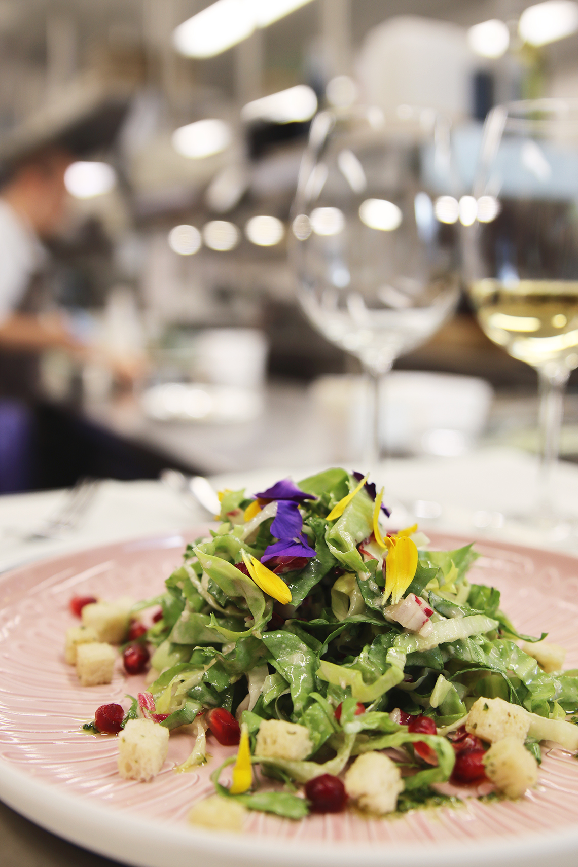 Für uns geht es mit dem zweiten Gang weiter, der uns über die Theke gereicht wird. Fein geschnittener Endiviensalat mit French-Dressing, Granatapfelkernen und Kräutercroûtons, dazu Blüten aus dem Garten der Küchenchefin Céline Weisse. Zwischendurch kümmern sich Kerstin Kneip und Michael Bost immer darum, dass wir nicht auf dem Trocknen sitzen. Die Wein- und Wasserbegleitung ist beim Arrangement „Christians Küchentisch“ immer inklusive.