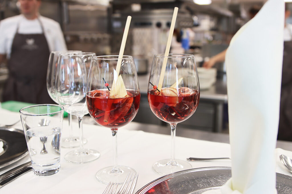 Während ich die ersten Fotos schieße und den Köchen genau auf die Finger schaue, geht es schon los mit der ersten kleinen Vorspeise – Spargelquiche mit Kresse und Currycreme. „Zubereitet und serviert von Lukas Schmitt, unserem Auszubildenden im dritten Lehrjahr“, erklärt Christian Münch-Buchna sichtlich stolz. Dazu genießen wir einen Aperitif aus rotem Viez, verfeinert mit dünn geschnittenen roten Apfelscheiben und Cranberry. Bis zu diesem Zeitpunkt stand ich Viez eher skeptisch gegenüber, aber dieser Aperitif überzeugt mich vom Gegenteil. Wirklich sehr zu empfehlen!