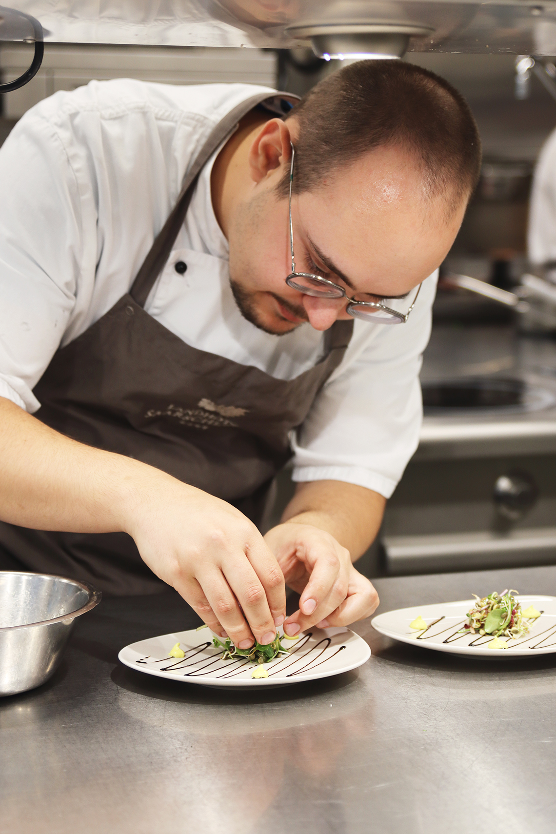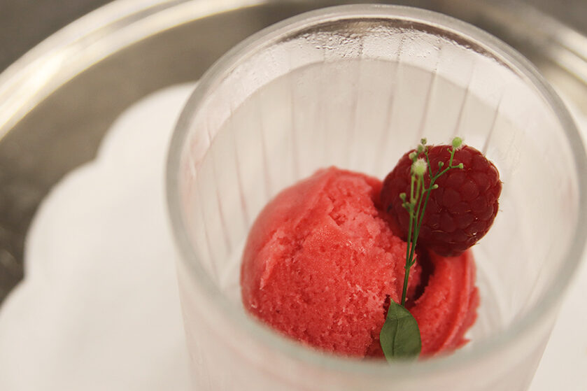 Danach geht es weiter mit einem kleinen leichten Zwischengang – einer Kugel hausgemachtem Himbeer-Waldmeister-Sorbet. So gut! Von diesem Sorbet würde ich am liebsten eine riesige Portion mit nach Hause nehmen. Während ich diesen Leckerbissen so langsam wie möglich genieße, schaue ich dem 37-jährigen Küchenleiter dabei zu, wie er die ersten Desserts des Abends zubereitet. Denn wir sitzen direkt vor dem für mich allerliebsten Posten der Küche – dort, wo der Nachtisch entsteht.