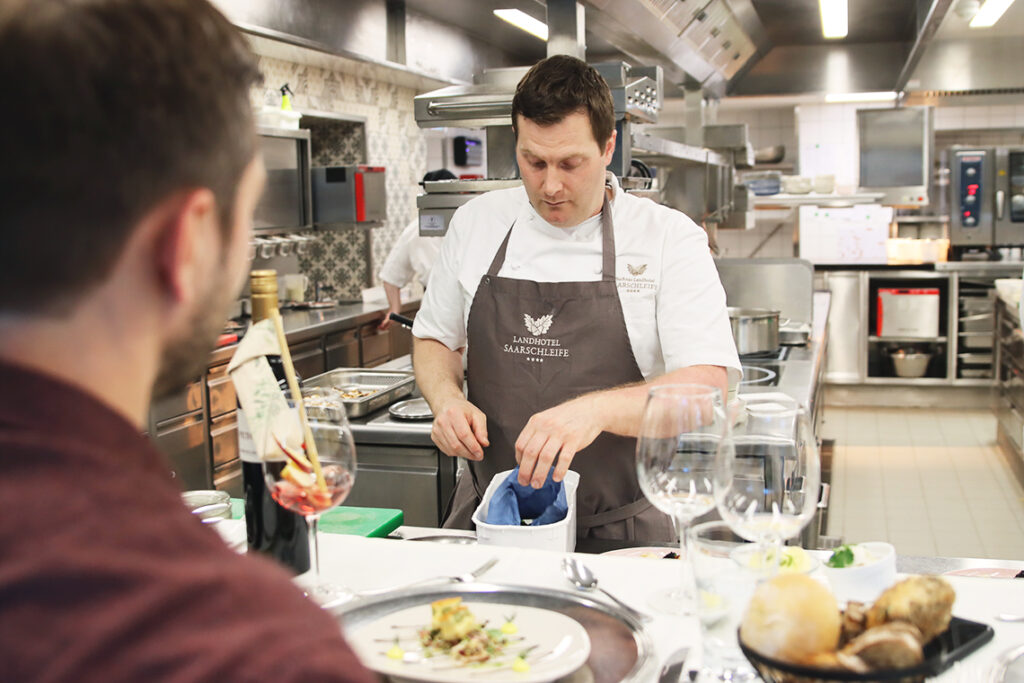 Während wir von unserem Platz am Küchentresen die Aussicht genießen und jeden Schritt, der in der Küche passiert, mitverfolgen, gibt uns der Küchenleiter immer mehr Einblicke in den Küchenalltag. Zum Beispiel wundern wir uns, woher die Servicemitarbeiter direkt wissen, wann sie zu den verschiedenen Posten kommen sollen, um die bestellten Speisen abzuholen. Hierzu gibt es nämlich nicht wie sonst üblich eine gewöhnliche Klingel oder ein Piepsen, sondern es werden zwei verschiedene Klänge mit unterschiedlichem Vogelgezwitscher abgespielt. So wird niemand gestört und die Atmosphäre bleibt, wie es sich für ein Landhotel gehört – naturnah. Ich bin immer wieder erstaunt, wie durchdacht alles im „Buchnas Landhotel Saarschleife“ abläuft. Auch die Küchenmitarbeiter wirken super ruhig und gelassen, selbst wenn auch mal etwas mehr Bestellzettel in der Warteschleife hängen.
