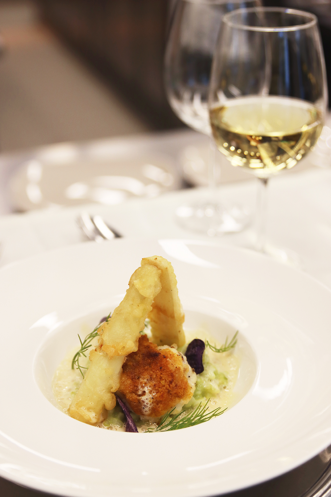 Für den Küchenabschnittsgefährten gibt es gebratenen Seeteufel mit Paprikakruste auf Erbsenrisotto und dazu gebackener grüner Spargel. Ich freue mich auf Erbenrisotto mit gebackenem weißen Spargel und dazu einen Erbsenkressesalat. Serviert von Daniel Lambeng, der den Saucier-Posten der Küche bekleidet und sich weitgehend um alles rund um Fleisch, Fisch und Suppen kümmert. Das Risotto ist wirklich der Hammer. Ich liebe Risotto und mag Erbsen total gerne und frage mich ehrlich, wieso ich diese Kombination vorher noch nie selbst ausprobiert habe.