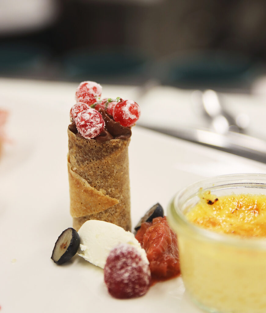 Als wenn das nicht schon genug wäre, zaubert uns Christian Münch-Buchna ein Dessert, das diesem Abend die Krone aufsetzt. Er reicht uns die Teller über die Theke und erklärt: „Auf euren Tellern findet ihr weiße Mousse im Orscholzer Tütchen, Erdbeerschnitte mit Pistazienbiskuit, Zitronensorbet, Cannelloni mit dunkler Mousse, Mascarponecreme mit Rhabarbergrütze und kleiner Crème brûlée“.