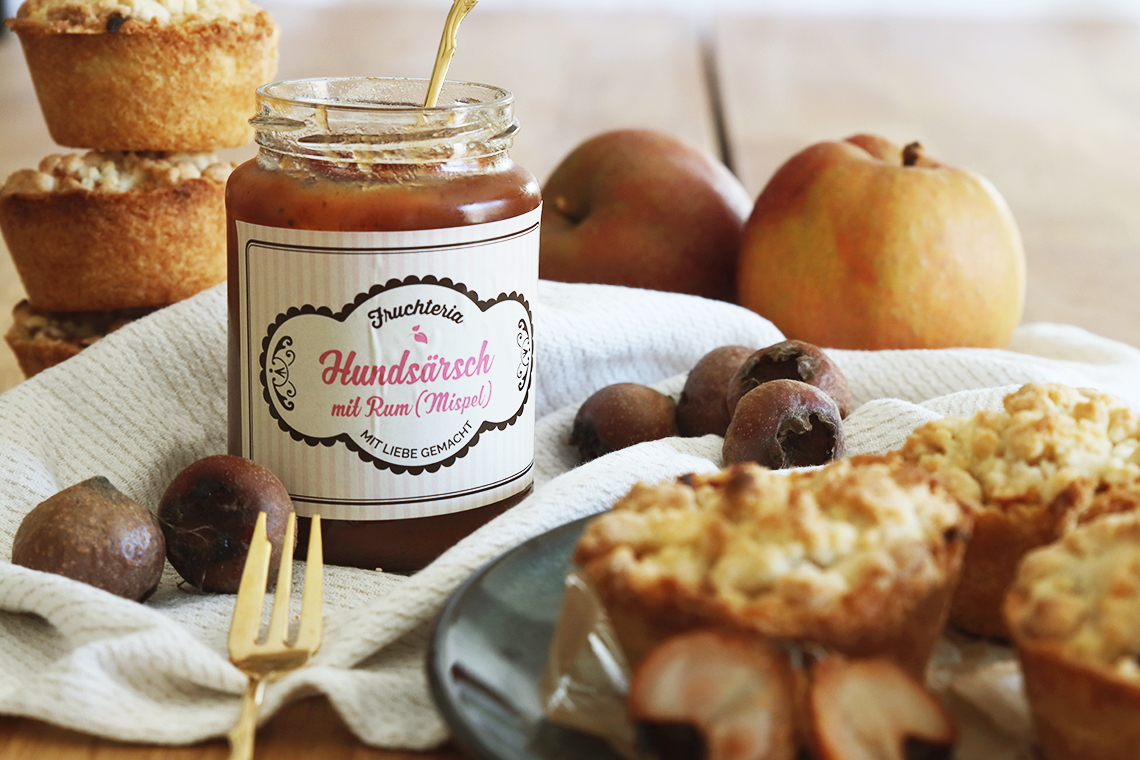 Die Mispeln für meine Mispel-Streusel-Muffins inklusive des leckeren „Hundsärsch mit Rum“-Fruchtaufstrich habe ich bei Andrea Dumont in der „Fruchteria“ im Saarbrücker Nauwieser Viertel bekommen. In Supermärkten sucht man Mispeln vergebens, da diese wirklich nur in sehr limitierten Mengen hierzulande verfügbar sind. Um aber möglichst lange immer etwas von solch einem saisonalen Obst zu haben, hat es sich die Inhaberin zur Aufgabe gemacht, alles einzukochen und weiterzuverarbeiten. Nach alten Familienrezepten werden dort allerhand Früchte, aber auch Gemüse zu süßen und herzhaften Aufstrichen, Sirups, Chutneys, Relishes, Grill- und Pasta-Saucen verarbeitet. Und das geschieht alles in Handarbeit. Qualität, die man einfach herausschmeckt. Regionaler könnten die Produkte der „Fruchteria“ wirklich nicht sein.