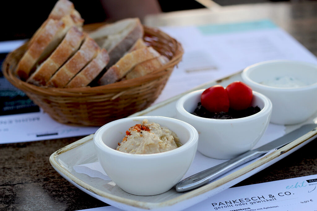 Richtig entspannt von unserem kleinen Spaziergang erreichen wir wieder die „Maimühle“ und wir machen es uns auf der Terrasse der „Mühlenwirtschaft“ gemütlich. Wir starten in den Abend mit einem frisch gezapften Radler, dazu gibt es Brot mit Oliven-Tapenade, Hummus aus sauren Bohnen und Kräuterquark.