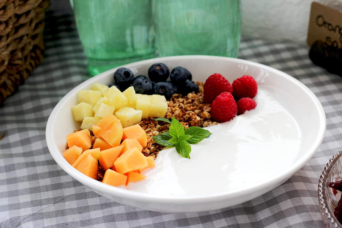 Oben angekommen, fehlen uns die Worte. Der Tisch ist mit so viel Liebe zum Detail gedeckt. Man fühlt sich sofort, als wäre man im siebten Brunchhimmel. Bevor wir Platz nehmen, erkunden wir erst einmal das kleine Büfett, das das Team der „Maimühle“ um den Tisch herum vor unserer Ankunft hergerichtet hat. Neben verschiedenen Säften, Käse, Bauernschinken, hausgemachtem Humus und Kräuterquark gibt es französischen Ziegenfrischkäse und Eier vom „Bauernhof Rock“ in Sinz. Auch frische Backwaren, hausgemachte Marmeladen oder auch palmölfreie Nuss-Nougat-Creme fehlen nicht.