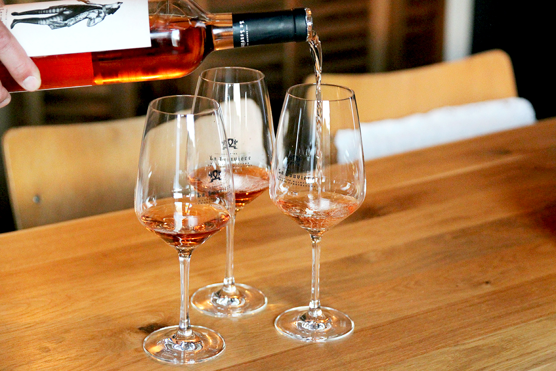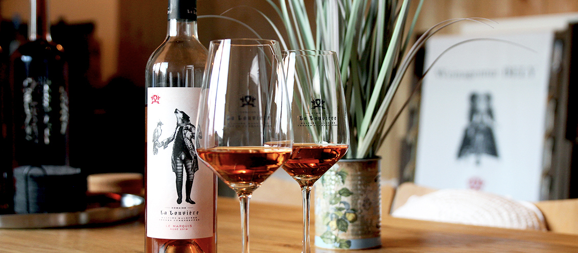 Wir bleiben aber bei den Franzosen und probieren einen Rosé – „Le Marquis“ von Domaine La Louvière. Dieser Wein kommt mir direkt bekannt vor, denn diese hübsch gestalteten Etiketten sind mir als Mediengestalterin bei der letzten „Weinzeit“ am Saarbrücker Staden sofort ins Auge gefallen. Auf diesen finden sich immer wieder verschiedene Wolf-Motive. Das kommt daher, dass folkloristische Überlieferungen besagen, dass sich die Wölfe damals in den Ausläufern der Pyrenäen in Südfrankreich versammelten, um die Landschaft zu erkunden und ihre Jagdgefährten anzutreffen. Heute wachsen die Trauben für die Weine von „Domaine La Louvière“ auf diesen Sammelplätzen.
